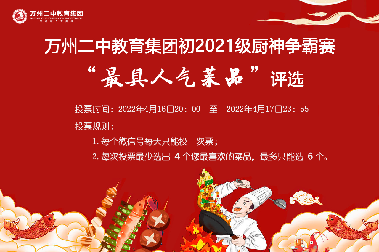 欢迎您参与万州二中教育集团初2021级厨神争霸赛“最具人气菜品”评选!