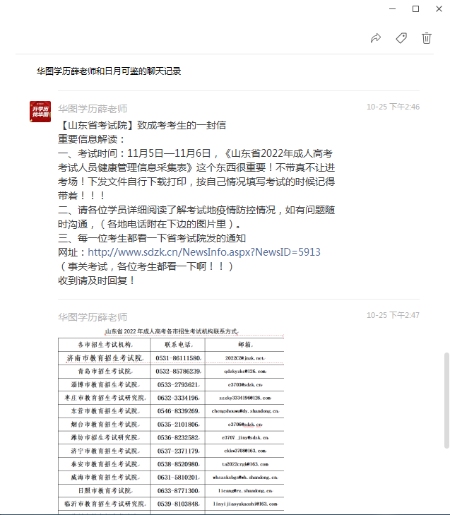 在微信上咨询过后,通过了解,加上了现在负责我的班主任老师,薛老师。薛老师耐心回答我的咨询问题,让我知道了成考教育也是国家承认,统一考试的。